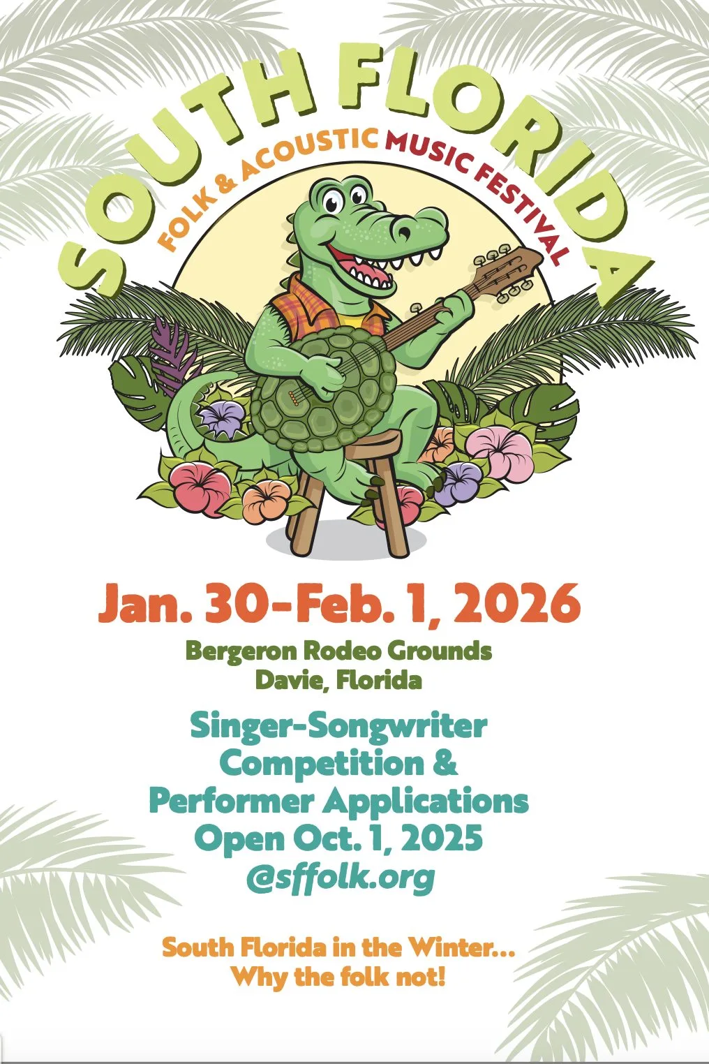 Other events include music jams, workshops, and a major songwriting contest. Over 20 vendors, food trucks, and raffles round out this amazing folk festival. You can attend the South Florida Folk and Acoustic Music Festival January 30 – February 1, 2026 at the Bergeron Rodeo Arena in Davie, Florida.